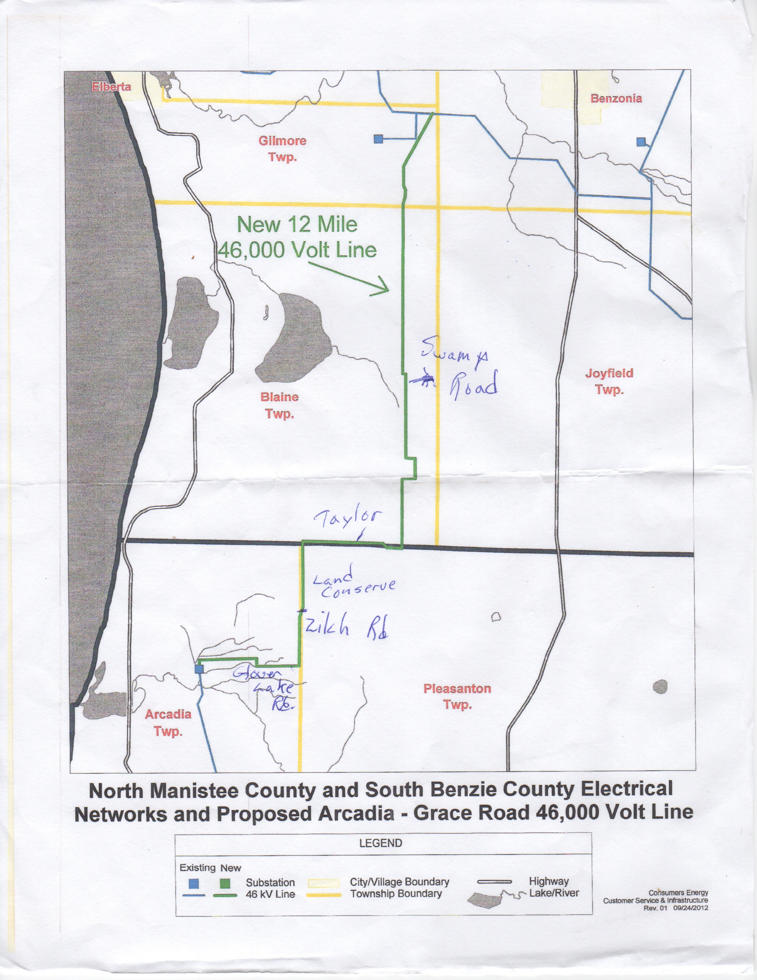 UPDATE: Just got a call (3:30 pm) from Roger Morgenstern, media rep for Consumers. He says the map presented to the Blaine leadership was a proposal and is not final. They took some questions from Blaine and will be incorporating that information into a revised proposal that they will be bringing again before the Blaine board. Morgenstern said the easement for the line is 160 feet wide, and that only 80 feet of that would be cleared (40 feet on either side of the poles).