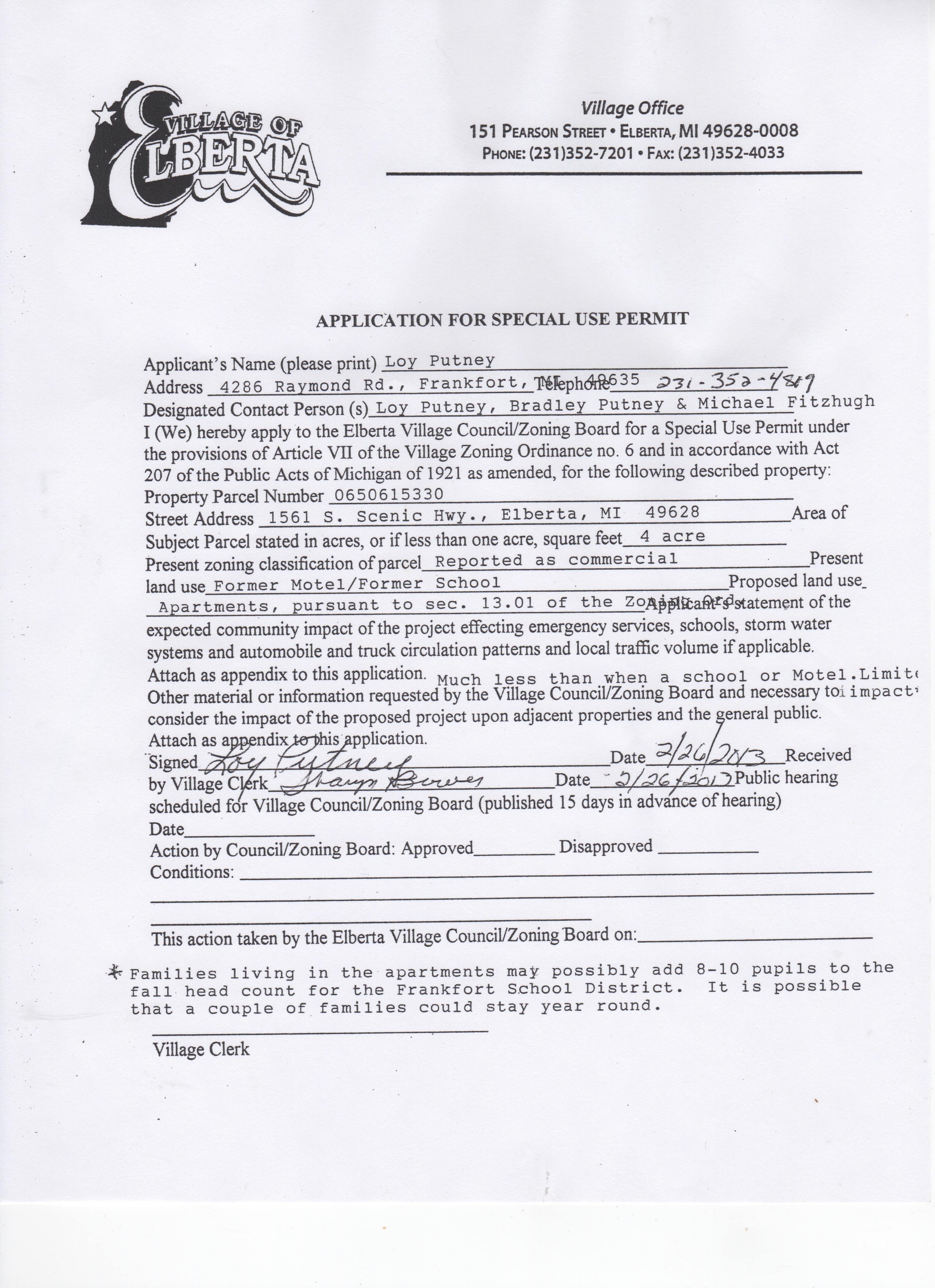 The second hearing concerns Loy Putney’s special use permit application to create “apartments” in the C-1 Commercial District at the old Bay Valley Inn property, which he purchased in March 2012.